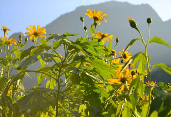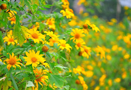 Hoa dã quỳ Ba Vì thường ra hoa vào cuối thu, đầu đông khoảng tháng 10 – 11 hàng năm và nở rộ trong khoảng 2 tuần, bắt đầu từ giữa tháng 11 dương lịch. Khắp sườn núi, trong các khu thắng cảnh của miền núi Ba Vì, trên nền xanh mướt của cỏ cây hoa lá, màu vàng hoa dã quỳ rực rỡ tô điểm cho cảnh sắc nơi đây bừng sáng, ấm áp. Đến Ba Vì trong khoảng thời gian này, du khách chụp ảnh, thưởng ngoạn hoa dã quỳ đẹp nhất vào buổi sáng, khi cái nắng của mùa đông vừa hừng lên, sương vẫn còn đọng trên lá và những cánh hoa dã quỳ. Núi Tản vào mùa hoa dã quỳ cũng như được khoác lên tấm áo họa tiết thiên nhiên sinh động khiến du khách đắm say, mê mải…